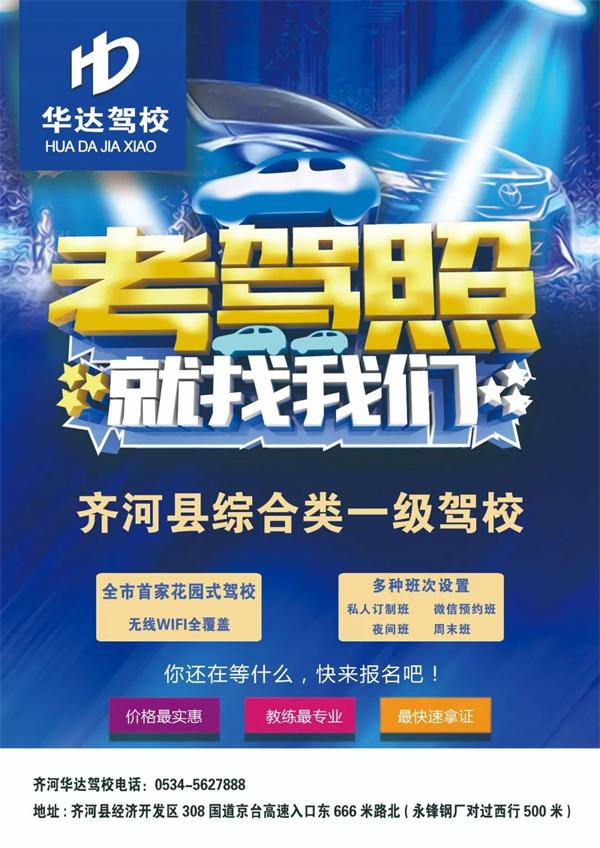 齐河华达驾校是即平原华达驾校后华达集团成立的第二个综合类一级驾校,华达驾校各科目考试合格率一直蝉联全市第一成为全市驾培行业的领跑者。荣获全国守合同重信用企业,全国先进驾校、山东省优秀交通安全驾校,山东省消费者满意单位,德州市规范化驾校、全市驾驶员培训企业先进单位、德州市五一劳动奖状。